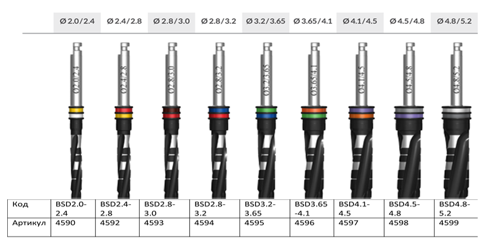 Хирургические сверла с лазерной маркировкой представлены в соответствии с рекомендуемой последовательностью сверления * Сверла выполнены из хирургической нержавеющей стали. Все сверла снабжены цветовой кодировкой и